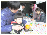 初めて行う作業、皆さん悪戦苦闘しながらもそれぞれ芸術性の高い(?)ピールアートを作成!皮をむいたみかんも美味しく頂きながら楽しい時間を過ごすことができました。