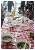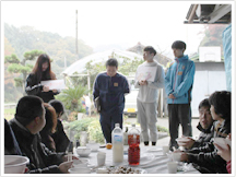 晴天であれば山の上で青空ランチの予定でしたが、雨がやむ気配も無く、泣く泣く室内でのランチに変更になりましたが、神奈川大学の学生さん達が朝早くから調理をしてくれており、豚汁やさつまいもごはん、里芋に煮物などをてきぱきと提供してくださいました。