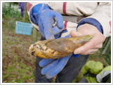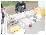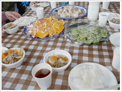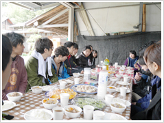午前の活動を終えると昼ごはんに。今回も神奈川大学の学生さん達が朝から用意してくださいました。今回のメニューは、白米・豚汁・ジャーマン里芋。デザートにネーブルとデコポンとキウイを頂きました!どれも美味しく、午後の活動にむけて英気を養いました。